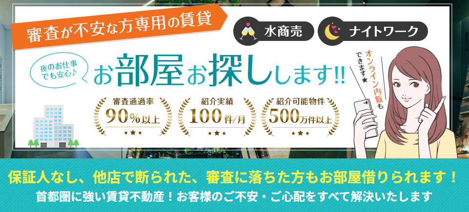 夜職が原因で審査落ちした方や保証人がいない方でも安心してご利用いただけます!入居審査やカードブラックでお困りの方、保証人がいない方もお気軽にご相談ください!