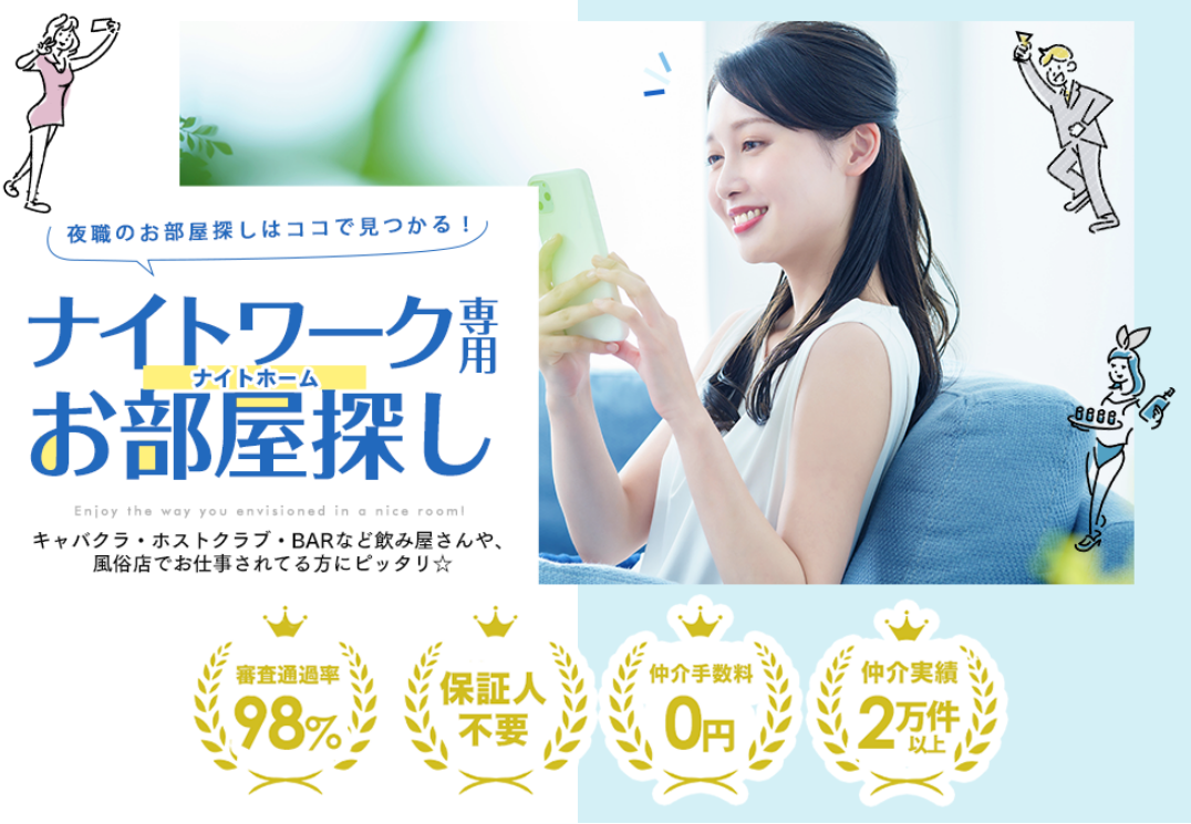 夜職はお部屋探しに当たって審査の心配が多いですが、各物件の事情にも詳しい我々が培ったノウハウと知識で審査が通るようにサポートいたします☆