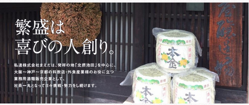 私ども株式会社まえだは、長年酒類業界に携わり、発祥の地である大阪府池田市を拠点に、大阪府、兵庫県、京都府に至る広い地域において、料飲店様・外食産業様・ホテル様にお役に立つ「業務用専門酒販店」として、社員一丸となって挑戦と努力をし続けています。